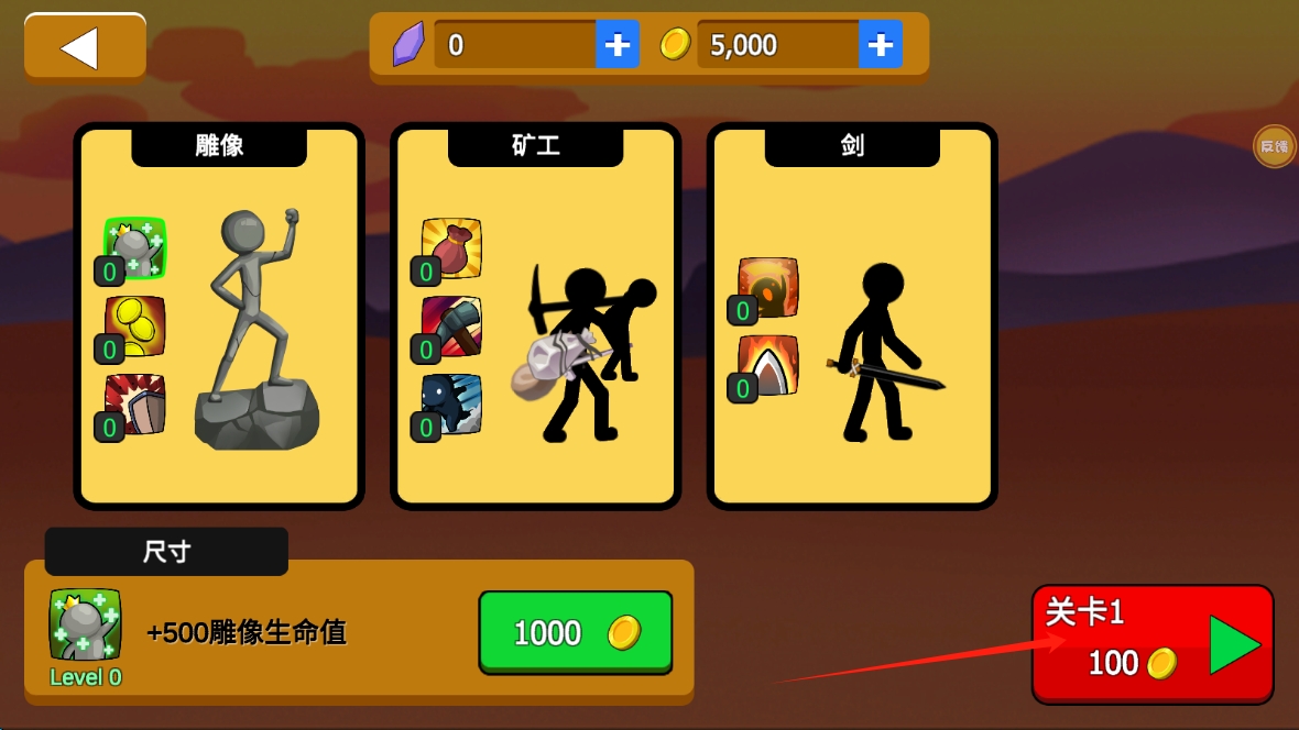 2、在資源和升級(jí)界面,優(yōu)先評(píng)估雕像的生命值情況,若金幣足夠,點(diǎn)擊選擇關(guān)卡。