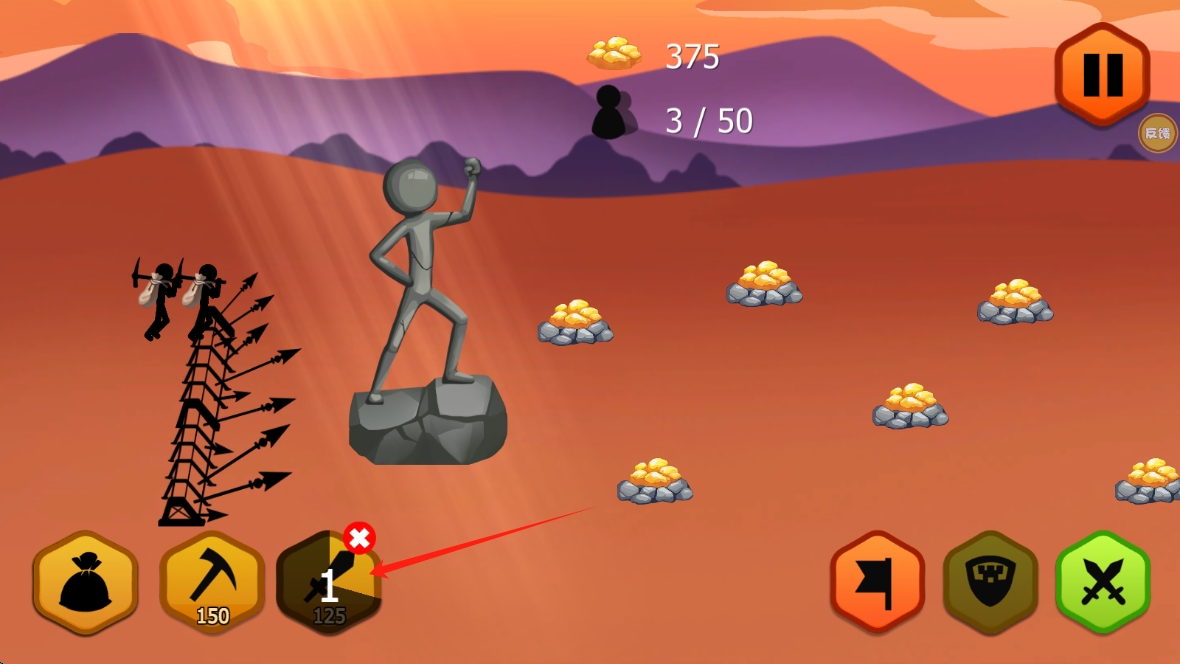 3、在戰(zhàn)斗界面,密切關(guān)注上方顯示的金幣數(shù)量和敵人數(shù)量,先點(diǎn)擊左側(cè)礦工按鈕。