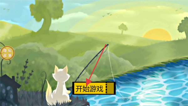 1、進(jìn)入游戲后,首先看到小貓釣魚的場(chǎng)景,點(diǎn)擊畫面中間的開始游戲按鈕,開啟釣魚之旅。