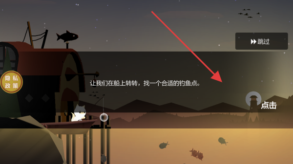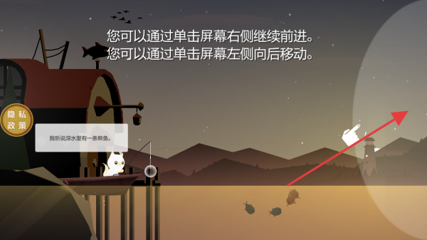 3、根據(jù)提示,您可以通過單擊屏幕右側(cè)繼續(xù)前進(jìn),單擊屏幕左側(cè)向后移動(dòng),以此來調(diào)整位置尋找魚群。