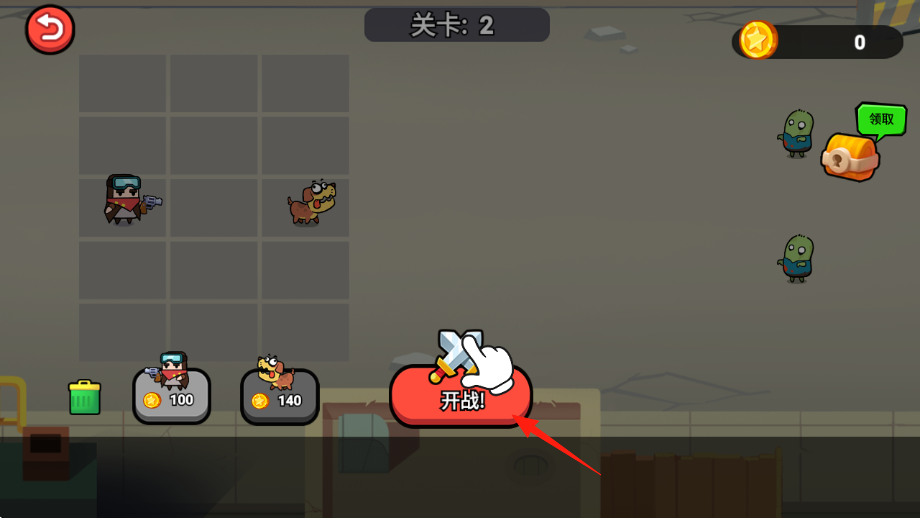 1、關(guān)卡2,可花費金幣100、140召喚角色持槍人物、狗,布置在方格陣,點擊開戰(zhàn)進(jìn)入戰(zhàn)斗。