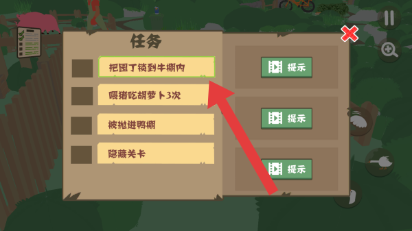 3、展示了任務欄內(nèi)的任務:把園丁鎖到牛棚內(nèi)、喂豬吃胡蘿卜3次等,可點擊提示任務如何完成。