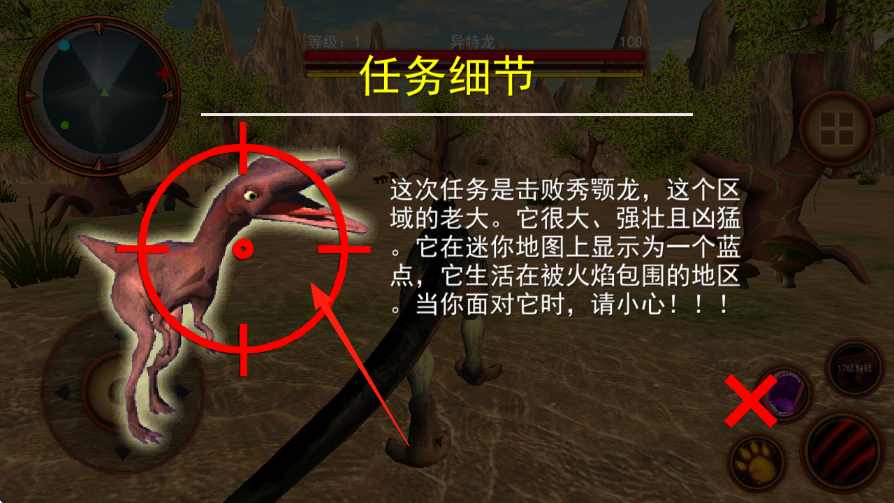 1、查看任務(wù)提示,需擊敗秀顎龍區(qū)域老大,火焰包圍區(qū),小地圖藍(lán)點,了解目標(biāo)特征大、強(qiáng)、兇。
