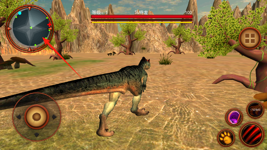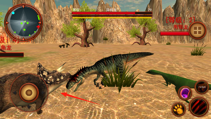 2、操控恐龍異特龍,按小地圖指引,前往火焰區(qū)域,途中留意其他恐龍角龍等,可利用戰(zhàn)斗提升等級。