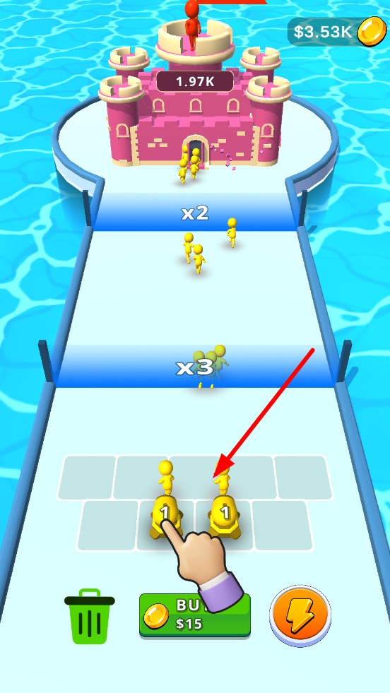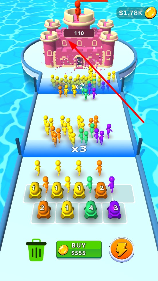 2、將小人合并后,獲得更高等級(jí)的小人,點(diǎn)擊右下角雷電圖標(biāo),加快小人沖刺速度,朝著敵方城堡沖刺,觀察敵方城堡血量。