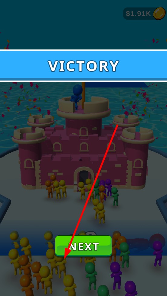 3、城堡破壞反饋:小人進(jìn)攻時(shí),城堡磚塊逐片崩裂,血量條實(shí)時(shí)變動(dòng);最終占領(lǐng)時(shí),城堡顏色替換為己方主色,視覺(jué)反饋強(qiáng)化玩家的勝利成就感。