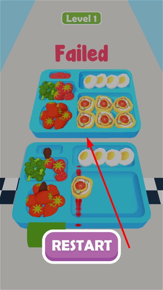 3、沖過終點(diǎn)后,系統(tǒng)對比餐盤與目標(biāo)布局,分類精準(zhǔn)度決定星級,若相差較大,則闖關(guān)失敗,需要重新游玩。