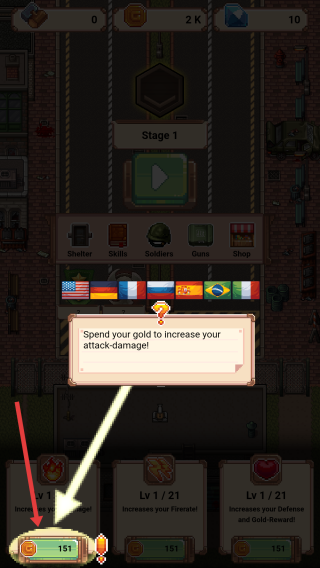 1、進(jìn)入游戲界面,點(diǎn)擊左下角標(biāo)有151的攻擊傷害升級(jí)按鈕,消耗金幣提升攻擊傷害,強(qiáng)化戰(zhàn)斗能力。