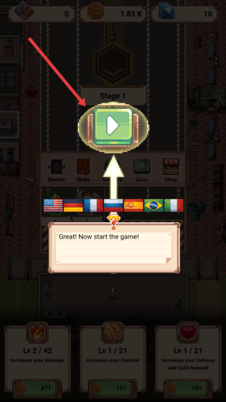 2、完成升級(jí)后,點(diǎn)擊Stage1下方綠色帶播放圖標(biāo)的按鈕,正式開啟第一階段游戲關(guān)卡。
