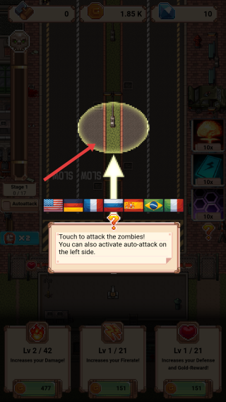 3、進(jìn)入關(guān)卡,依據(jù)提示觸摸道路區(qū)域攻擊僵尸,也可開啟左側(cè)自動(dòng)攻擊,沿道路推進(jìn)消滅僵尸,完成關(guān)卡挑戰(zhàn)。