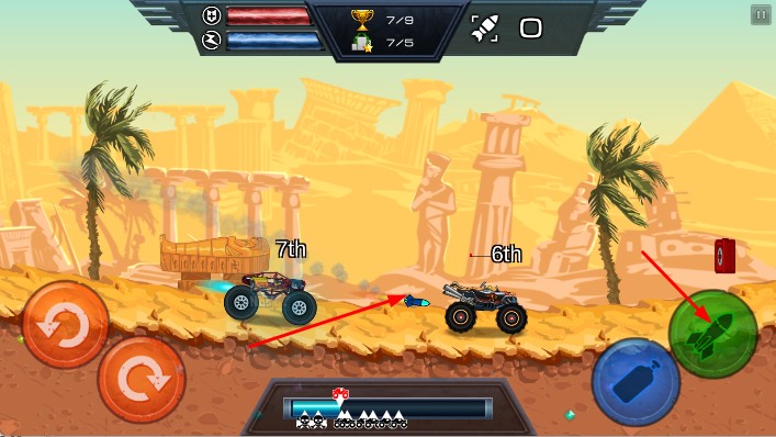 2、車輛操控系統(tǒng)豐富: 傾斜按鍵調(diào)節(jié)車身平衡,搭配火箭等道具按鍵,特技動作、漂移的操作自然施展,從基礎(chǔ)行駛到高階技巧,操控維度多元且直觀。