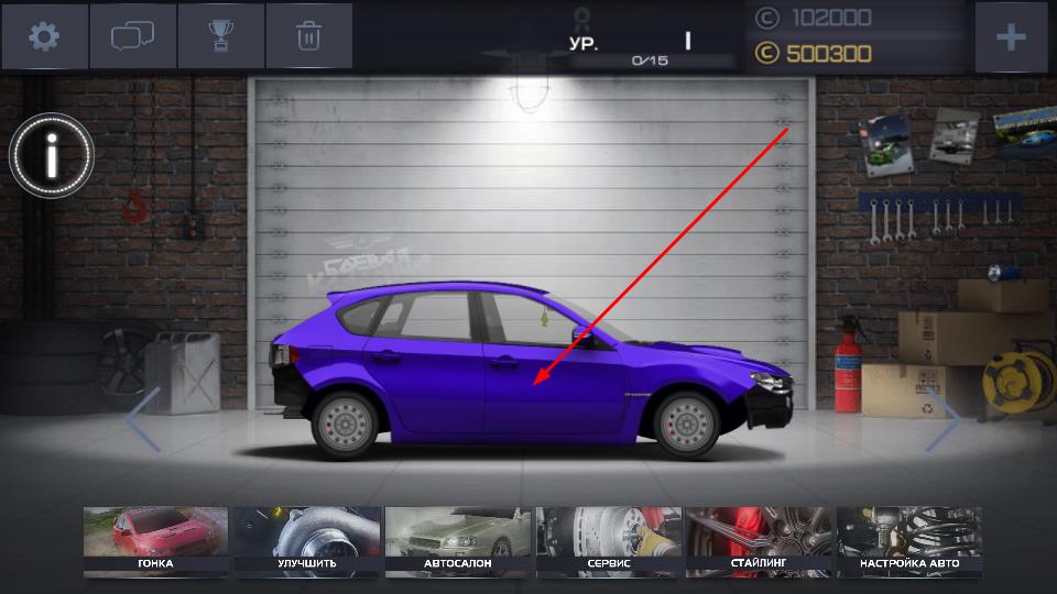 1、車庫(kù)界面選擇紫色汽車,利用金幣500300通過(guò)、гонка競(jìng)賽、улучшить升級(jí)等功能改裝車輛,提升性能。