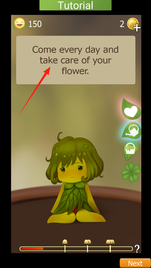 1、進入教程界面,看到提示,意思是得天天來照料小花,右邊有愛心水壺這些圖標,點它們給小花澆水關愛,讓FlowerGirl開心,跟著教程,把日常照料做起來。
