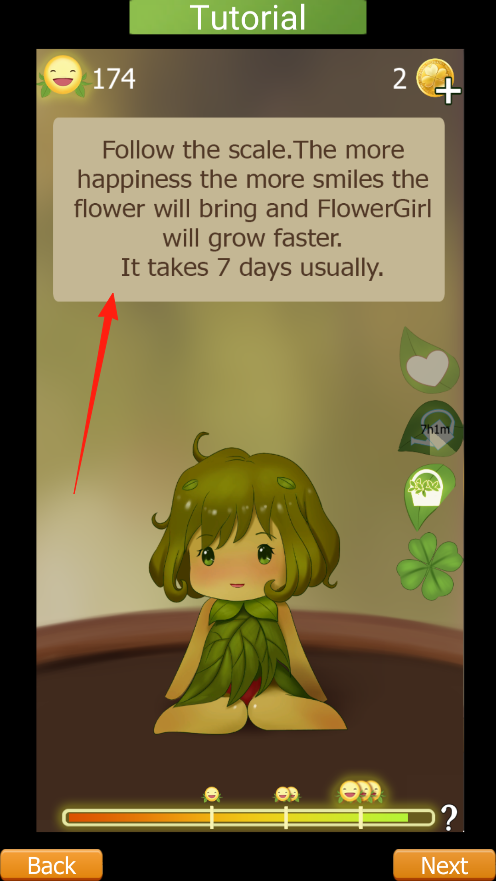 2、教程第二步,提示Follow the scale,要關注下方進度條小花開心值越高,帶來的笑臉越多,按照提示,繼續(xù)用互動讓進度條變化,看著FlowerGirl慢慢變開心長大。