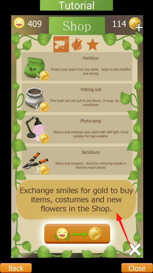 3、到商店教程,提示能用笑臉換金幣買東西,把積累的笑臉通過下方按鈕兌換成金幣,用金幣買肥料花盆土這些道具,給小花用讓它長得更好,也能買新花和服裝,豐富養(yǎng)花體驗。