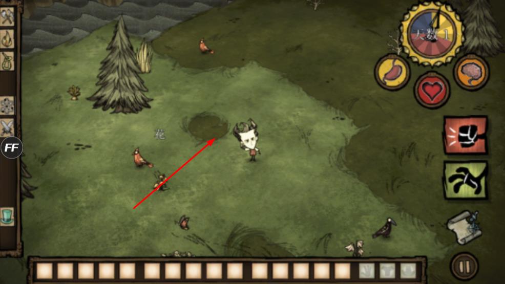 3、進(jìn)入野外場(chǎng)景后,操控角色探索地圖,借助左側(cè)功能欄與右側(cè)狀態(tài)圖標(biāo),采集資源、維持生存。