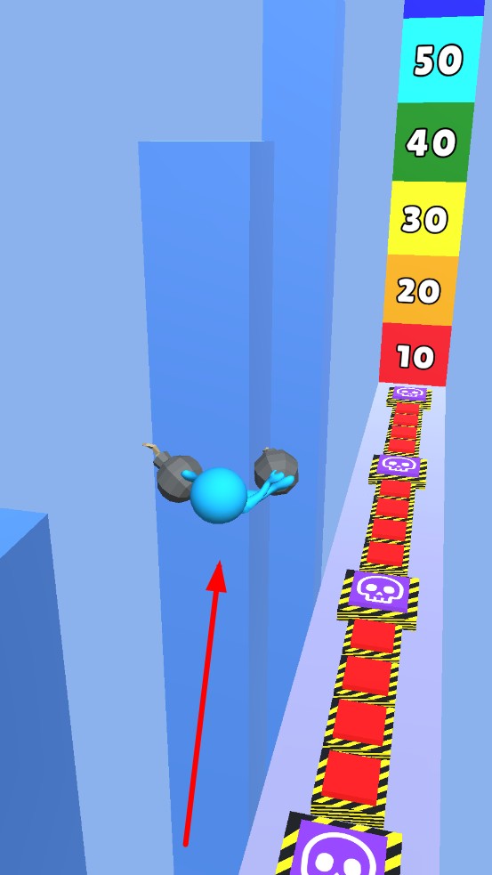 1、開局滑動(dòng)操控小人左右移動(dòng),降落到紅色區(qū)域時(shí)候,長(zhǎng)按使小人跳躍,收集在上空的炸彈,為后續(xù)的通關(guān)鋪路。