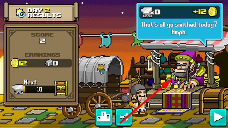 1、進入點擊鐵匠,出現(xiàn)在像素風格的鐵匠鋪,根據(jù)初始任務提示,點擊鍛造臺開始制作首個基礎道具。