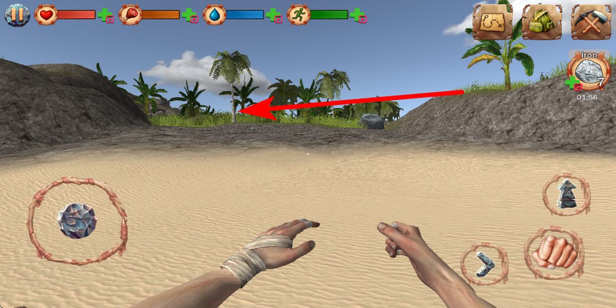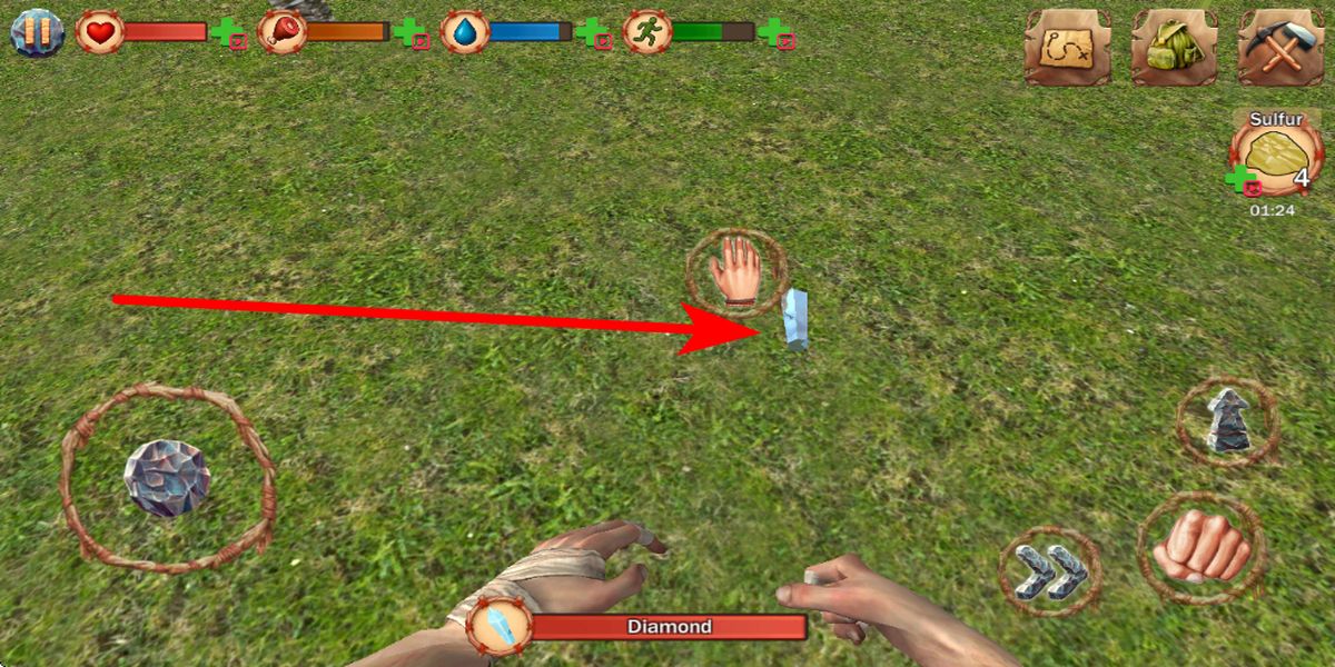 3、一旦發(fā)現(xiàn)地面存在可拾取物品,迅速點(diǎn)擊手掌樣式的拾取圖標(biāo),獲取資源續(xù)可靈活用于制作實(shí)用工具、建造庇護(hù)設(shè)施,全方位助力島上生存。