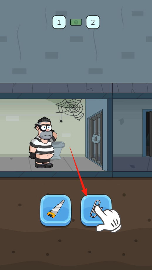 2、到關(guān)卡場景,小偷被關(guān),地下有鋸子和回形針道具,點(diǎn)回形針,用它去開牢房門鎖,選對道具,幫小偷逃出牢房,繼續(xù)逃跑流程,找對工具是關(guān)鍵,試試回形針咋用。