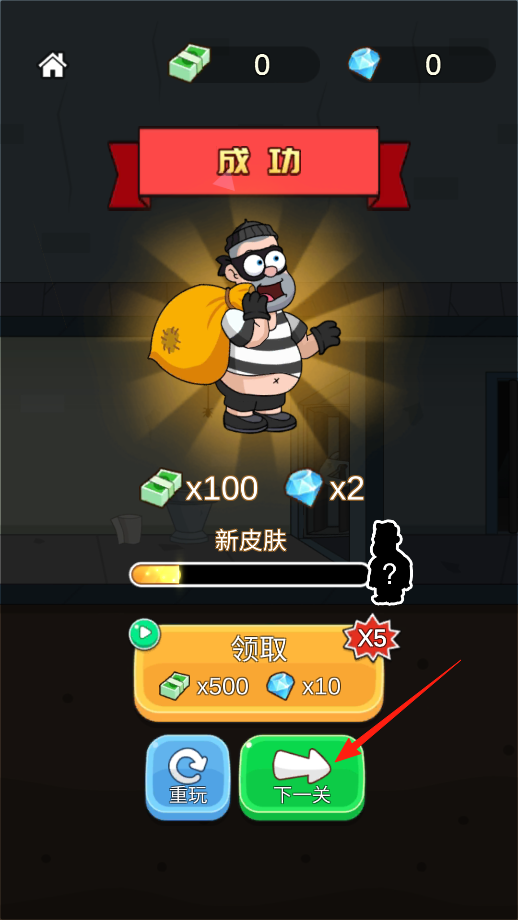3、成功通關(guān),小偷拿到財(cái)寶,顯示獎(jiǎng)勵(lì),想接著玩下一關(guān),點(diǎn)下一關(guān)按鈕,繼續(xù)幫小偷挑戰(zhàn)新關(guān)卡,解鎖更多逃跑姿勢,想重玩點(diǎn)重玩再體驗(yàn)一次,爭取拿更多獎(jiǎng)勵(lì)。