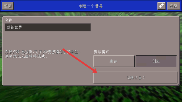 2、在創(chuàng)建世界界面,選好模式后通過點(diǎn)擊創(chuàng)建世界,即可生成屬于自己的游戲世界空間。