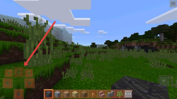 3、進(jìn)入游戲世界后,按箭頭指示點(diǎn)擊按鈕進(jìn)行移動(dòng),可點(diǎn)擊界面下方快捷欄方塊,進(jìn)行采集放置等基礎(chǔ)操作。