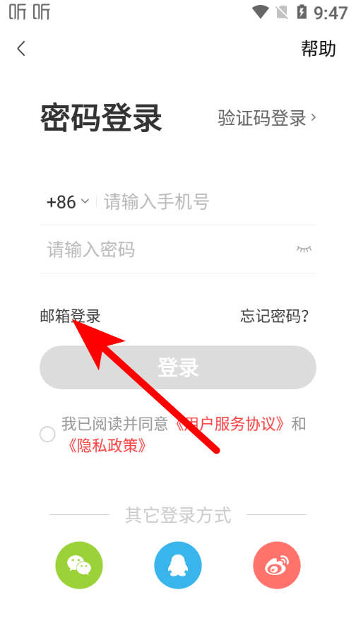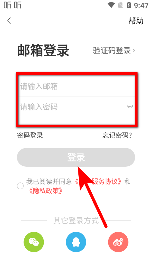 5、在郵箱登錄界面,輸入郵箱和密碼,勾選協(xié)議后點(diǎn)擊登錄,即可完成郵箱登錄操作。