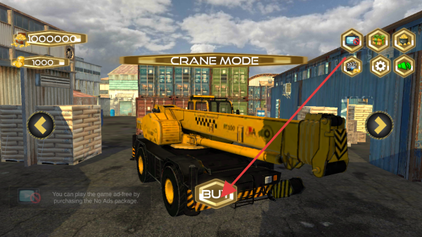 2、在CRANE MODE界面,點(diǎn)擊BUY箭頭指向,可購買相關(guān)內(nèi)容,或利用右上角功能鍵如設(shè)置、道具調(diào)整游戲。