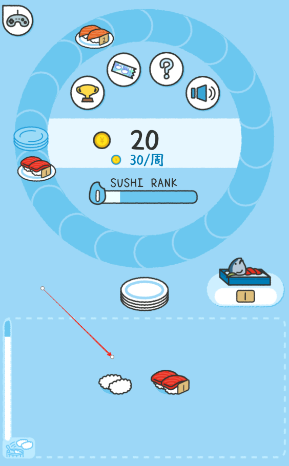 1、點擊下方食材區(qū)域,將相同壽司合并,生成新種類壽司,不斷合并提升壽司等級,積累金幣。