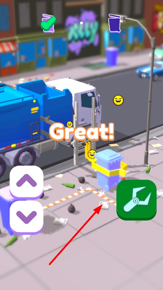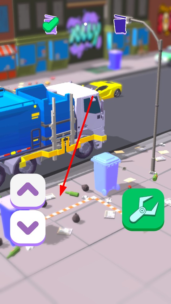 1、進(jìn)入游戲后,街道場(chǎng)景中點(diǎn)擊上下箭頭按鈕,控制垃圾車(chē)機(jī)械臂伸縮擺動(dòng),調(diào)整機(jī)械臂角度對(duì)準(zhǔn)垃圾桶,準(zhǔn)備開(kāi)啟抓取操作。