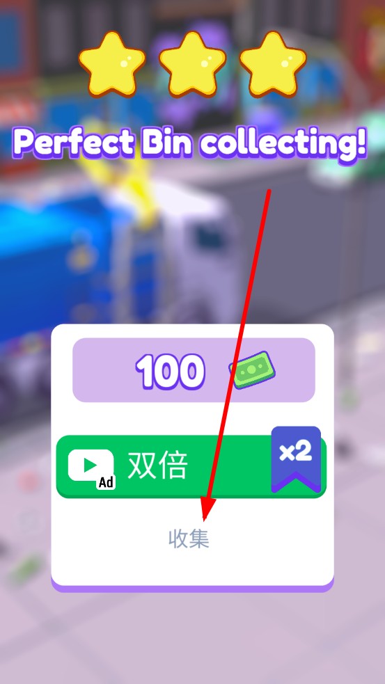 3、完成街道清潔后,界面彈出結(jié)算面板,展示金幣獎(jiǎng)勵(lì)數(shù)值,點(diǎn)擊收集直接領(lǐng)取收益,若想翻倍獎(jiǎng)勵(lì),可選擇觀看廣告,解鎖更高效的清潔工具。