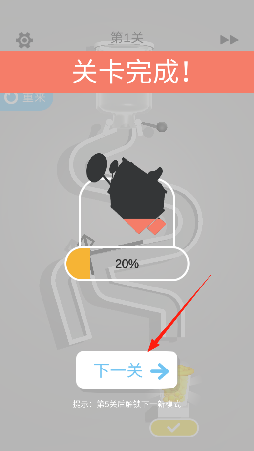 2、第一關(guān)完成啦,還有進(jìn)度條顯示完成了20%,現(xiàn)在點(diǎn)擊下一關(guān)按鈕,就能進(jìn)入第二關(guān),繼續(xù)體驗(yàn)新的關(guān)卡內(nèi)容,看看第二關(guān)會(huì)有什么不同的挑戰(zhàn)。