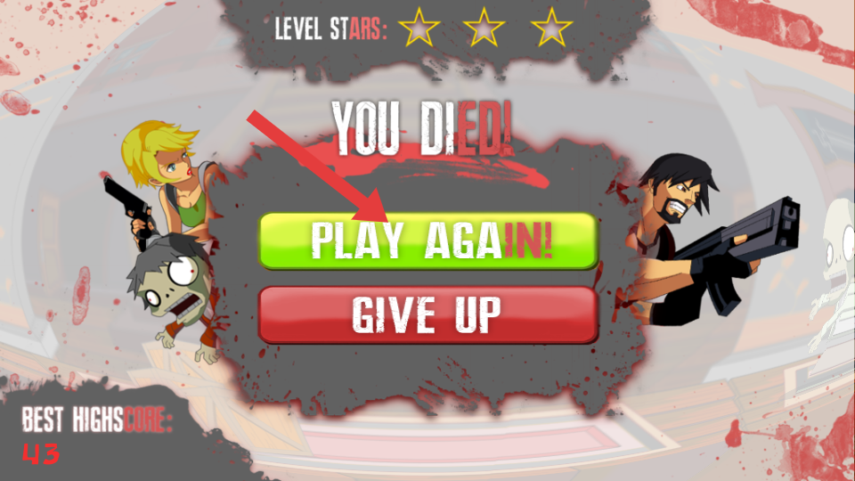 3、碰到障礙物或者僵尸則挑戰(zhàn)失敗,界面顯示你死了,點擊箭頭標(biāo)注的PLAY AGAIN重新游玩按鈕,重啟本次的挑戰(zhàn)。