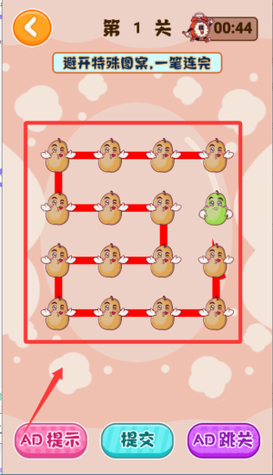 3、如果時間快到了還沒連完,可以看廣告獲取提示,按提示路線操作能快速完成關(guān)卡順利進(jìn)入下一關(guān)。