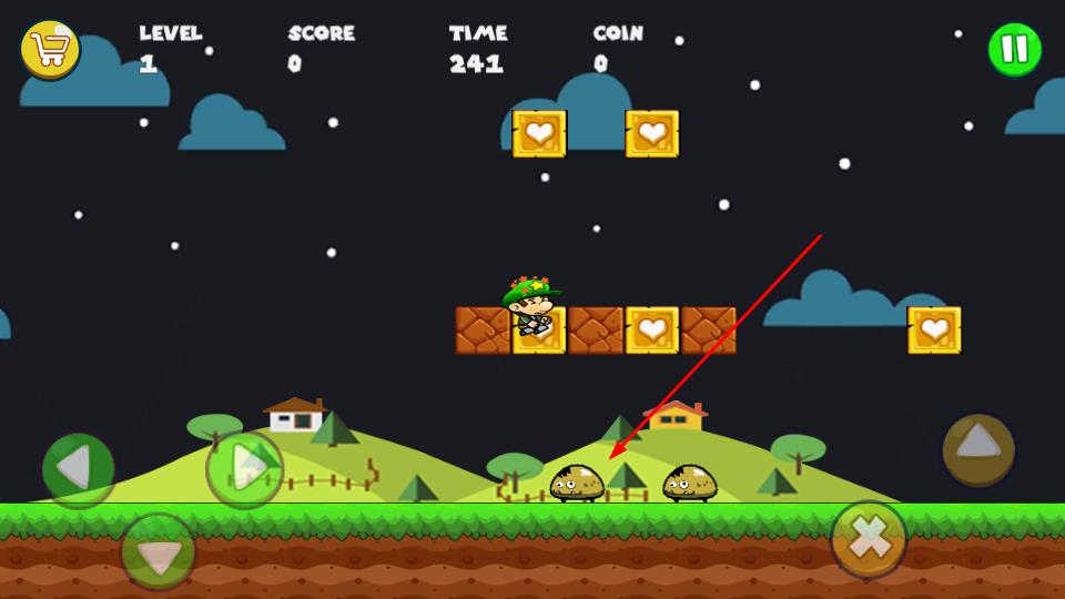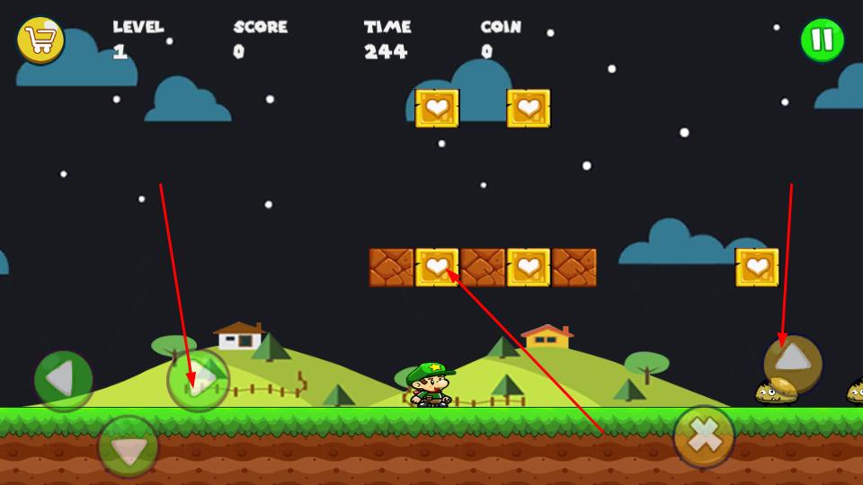 2、操作移動左側(cè)按鈕控制角色左右行進(jìn),右側(cè)三角鍵觸發(fā)跳躍動作,需精準(zhǔn)操作讓角色收集空中及平臺上的愛心方塊,同時警惕地面爬行怪物。