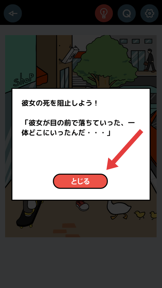 1、劇情提示界面出現日文文本彼女の死を阻止しよう等,點擊紅色とじる按鈕,關閉提示框,繼續(xù)游戲劇情。