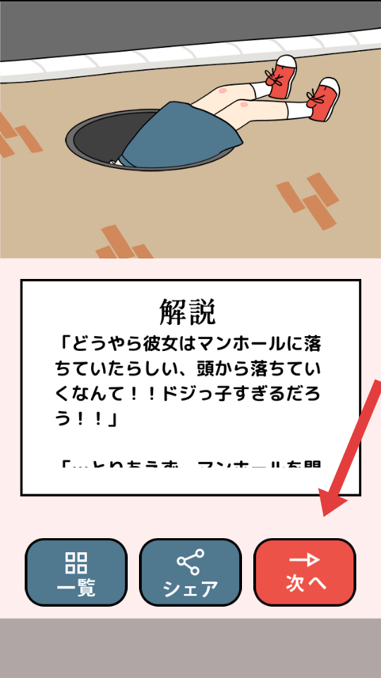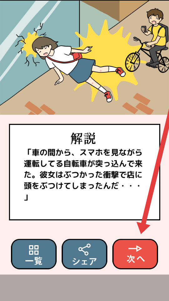 3、閱讀她被自行車撞倒的解說后,點擊紅色次へ的按鈕,繼續(xù)下一關的劇情,探尋阻止死亡的方法。