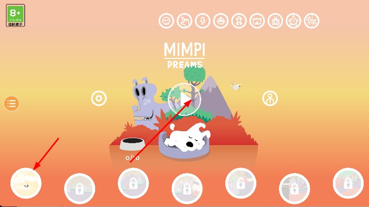 1、進入游戲,選解鎖關(guān)卡,點擊按鈕開啟冒險,操控小狗小明,依據(jù)指引開始旅程。