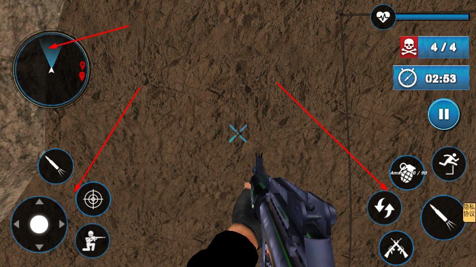 3、游戲中通過左側(cè)虛擬搖桿移動角色,點擊瞄準按鈕鎖定僵尸,利用武器射擊,依據(jù)地圖指示完成獵殺目標。