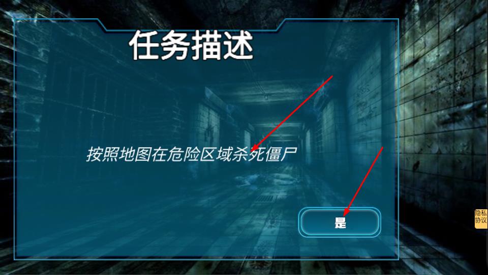 2、進入在任務(wù)描述界面,確認按照地圖在危險區(qū)域殺死僵尸任務(wù),然后去點擊是按鈕開啟關(guān)卡。