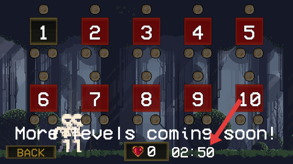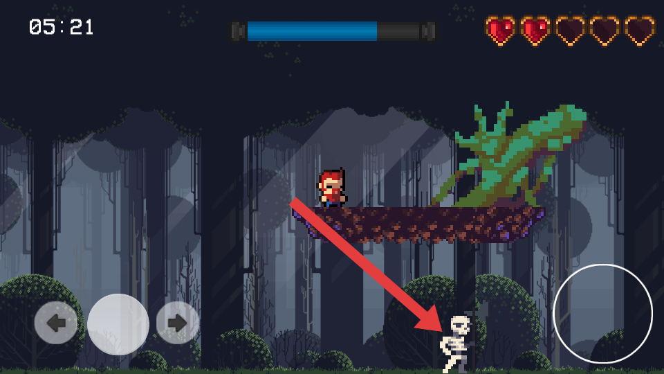 1、在森林關(guān)卡計時05:21,操控角色躲避底下的骷髏敵人,利用跳躍鍵進(jìn)行跳躍,注意上方藍(lán)條血量和右上角紅心生命數(shù)。