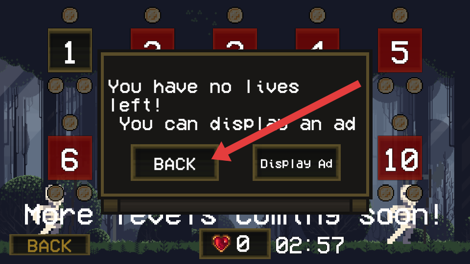 2、若生命耗盡,界面彈出提示You have no lives left,點擊箭頭標(biāo)注的BACK按鈕,返回關(guān)卡選擇的界面。