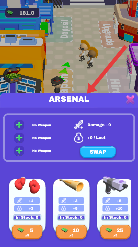 1、進入ARSENAL武器庫界面,查看當前無武器狀態(tài)的屬性,依據現有金幣181,選擇花費5金幣購買手套、10金幣購買喇叭或25金幣購買槍。