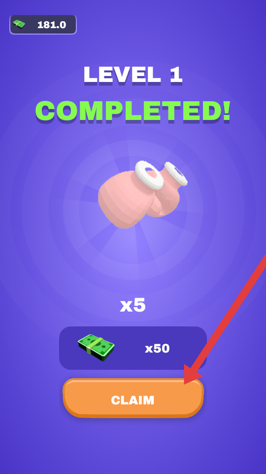 3、完成LEVEL1關卡后,可以領取獎勵,手套×5與金幣×50,點擊橙色CLAIM按鈕收取獎勵,積累資源用于后續(xù)武器購買。