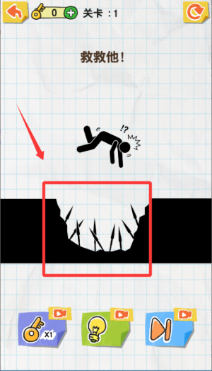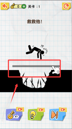 1、先觀察關(guān)卡里火柴人的位置和危險(xiǎn)來(lái)源,比如尖刺或敵人。然后想好畫(huà)線的位置和形狀,比如畫(huà)個(gè)箱子擋住落石。