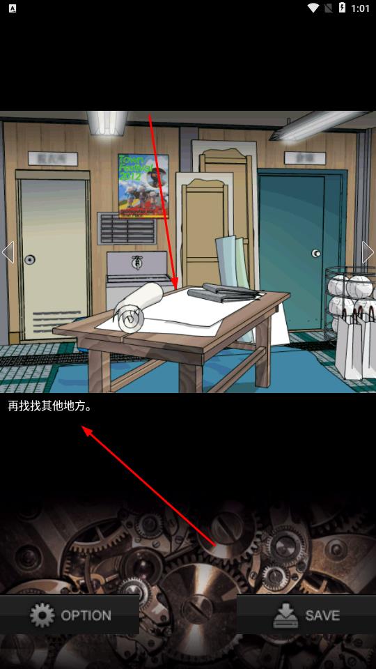 3、通過(guò)場(chǎng)景互動(dòng)開(kāi)門(mén)、調(diào)查物品推進(jìn)劇情,利用界面OPTION調(diào)整設(shè)置、SAVE留存進(jìn)度,逐步揭開(kāi)體育館傳言背后的秘密。