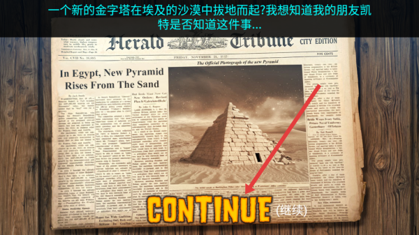 3、報紙劇情界面點擊下方黃色CONTINUE繼續(xù)按鈕,進入后續(xù)環(huán)節(jié),探尋埃及新金字塔秘密。