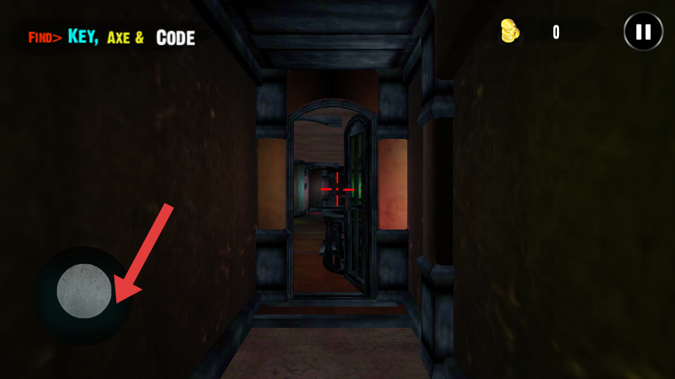1、進(jìn)入昏暗走廊,用左側(cè)的搖桿移動,依據(jù)頂部的提示,沿箭頭的方向繼續(xù)探索房間,留意門與通道。