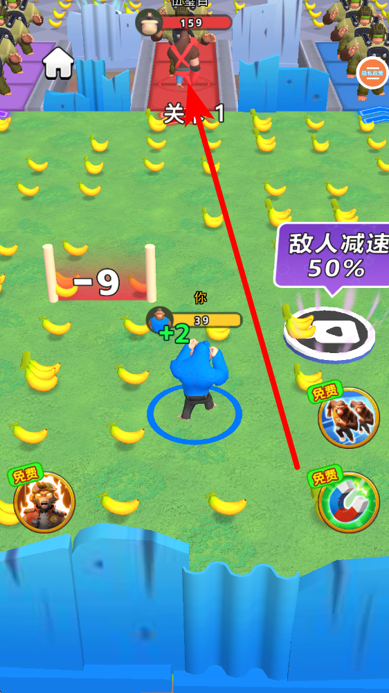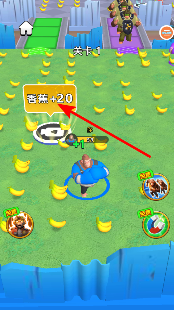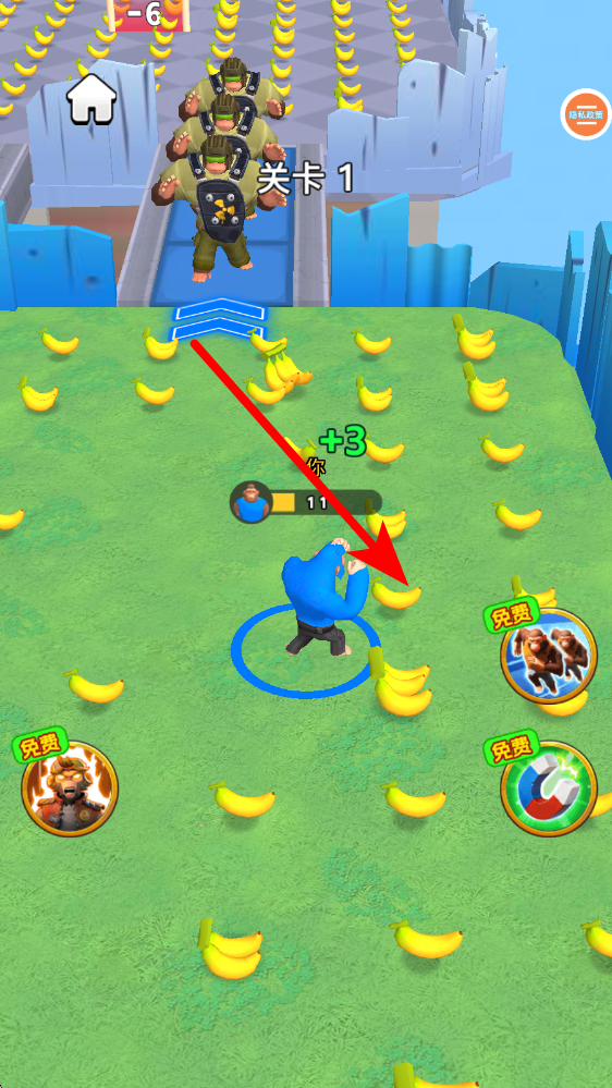 1、進(jìn)入關(guān)卡場景后,精準(zhǔn)操控角色靈活移動(dòng),優(yōu)先拾取地面散落香蕉,持續(xù)積累數(shù)量以提升角色屬性,同時(shí)留意免費(fèi)技能道具位置,為即將應(yīng)對的敵人做好準(zhǔn)備。